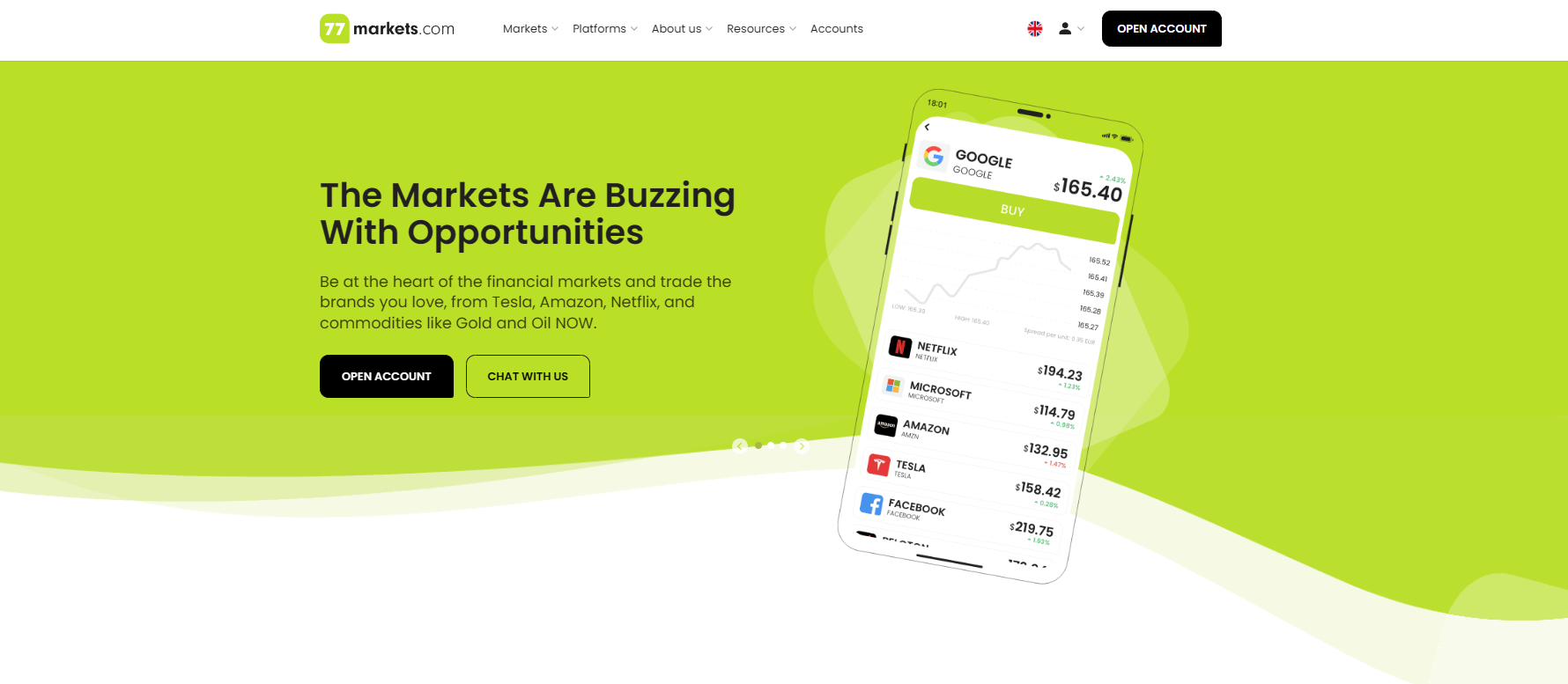 The official website of broker 77Markets gives the impression of a typical offshore company resource. Its structure is standard: at the top is the main menu with the sections Markets, Platforms, About Us, Resources, and Accounts, along with buttons to open an account and select the interface language. At the bottom of the page is a risk warning block as well as legal information about the brand owner — Leadcapital Corp Ltd, registered in the Seychelles and licensed by the FSA under number SD007.