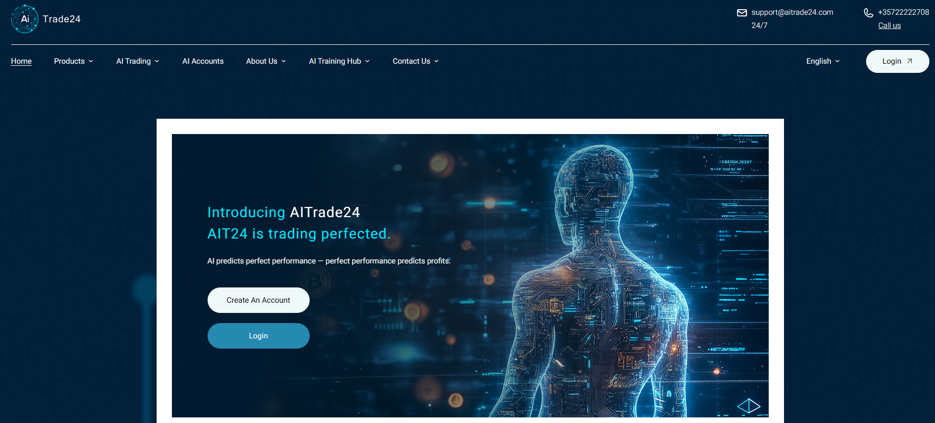 The first thing that stands out on AITrade24.com is its aggressive futurism. The homepage is filled with neon “robot-human” silhouettes, digital circuit patterns, and the word “AI” scattered everywhere, as if that alone made the platform intelligent. However, behind the glossy facade lies a complete lack of substance. Everything is built on slogans like “AI predicts perfect performance” and “emotion-free trading”. There’s no real evidence of artificial intelligence at work, no technical data, no trading terminal screenshots, and no reports, just pretty words meant to impress inexperienced traders.