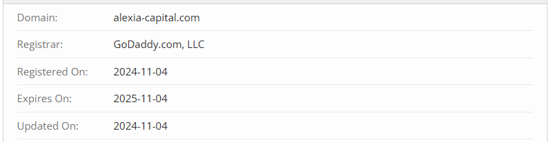 Next, let’s address the duration of the operation. The broker is silent on this as well. We couldn’t find any mention of when the platform was established, which clearly indicates they had something to hide. Visit the website of any reputable and legitimate company, and you’ll find a detailed history of its development from the very beginning. So, when was this platform launched? It’s simple — November 2024. That’s when the domain alexia-capital.com was registered.