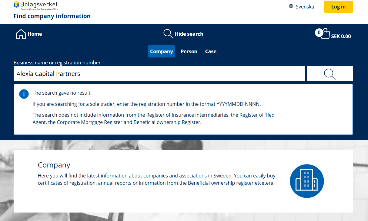 The headquarters are supposedly located in Sweden, but this is a fake address. Never take a website’s claims at face value. Always conduct your own verification through official registries. We checked with the Swedish Companies Registration Office (Bolagsverket) and found no record of an organization named Alexia Capital Partners. It’s clear that the scammers listed a fake address.