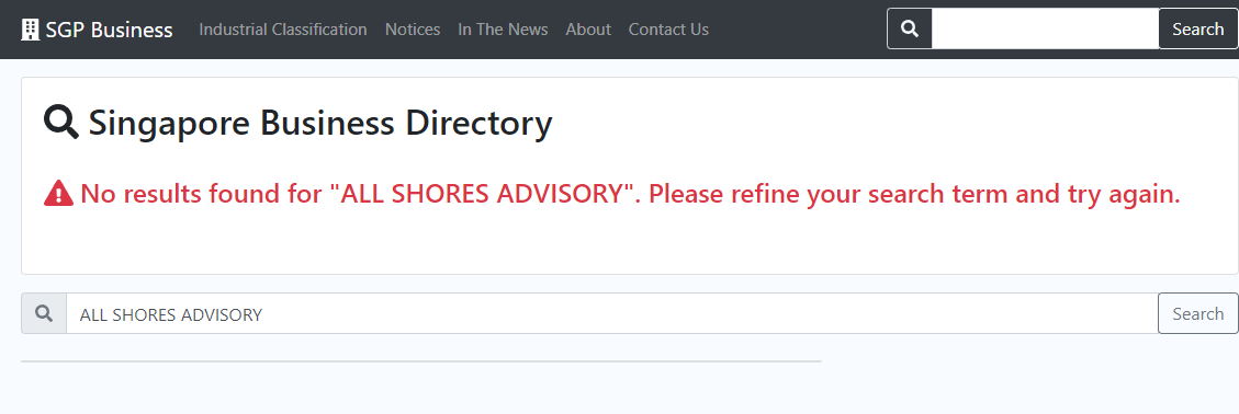 The fact is, this company isn’t even registered in Singapore. All Shores Advisory is absent from the legal registry. This raises the question: where is the company actually registered? And the most likely answer is nowhere.