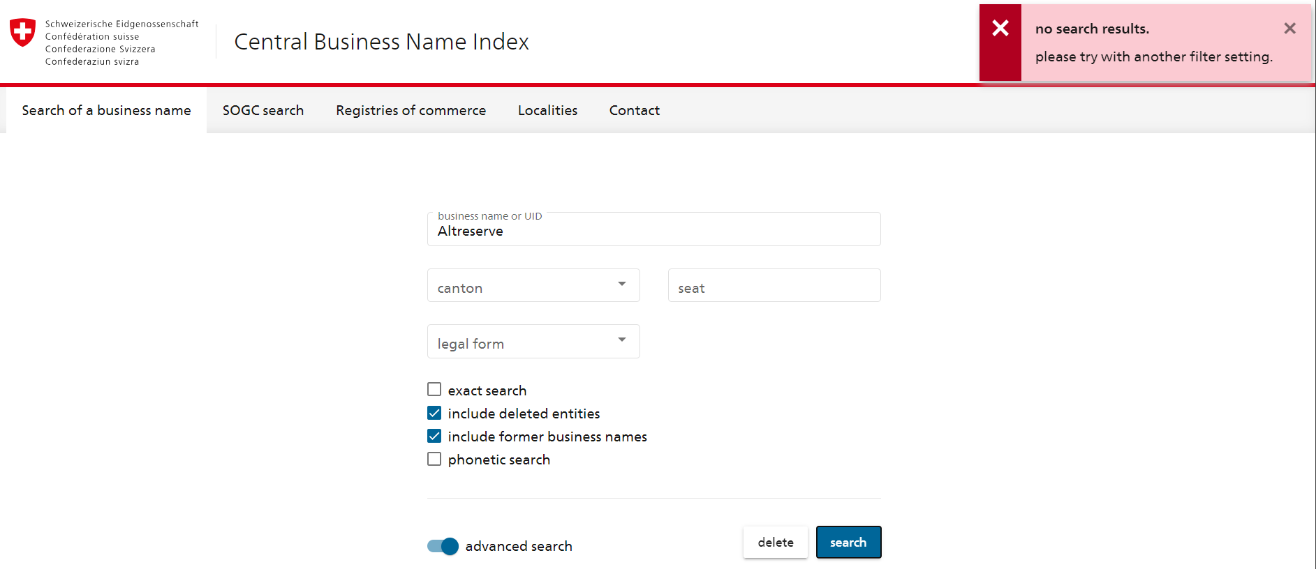 As it turns out, even the business name Altreserve does not appear on the Swiss registry. The same situation was found in the database of the UK Companies House and Poland’s business registry.