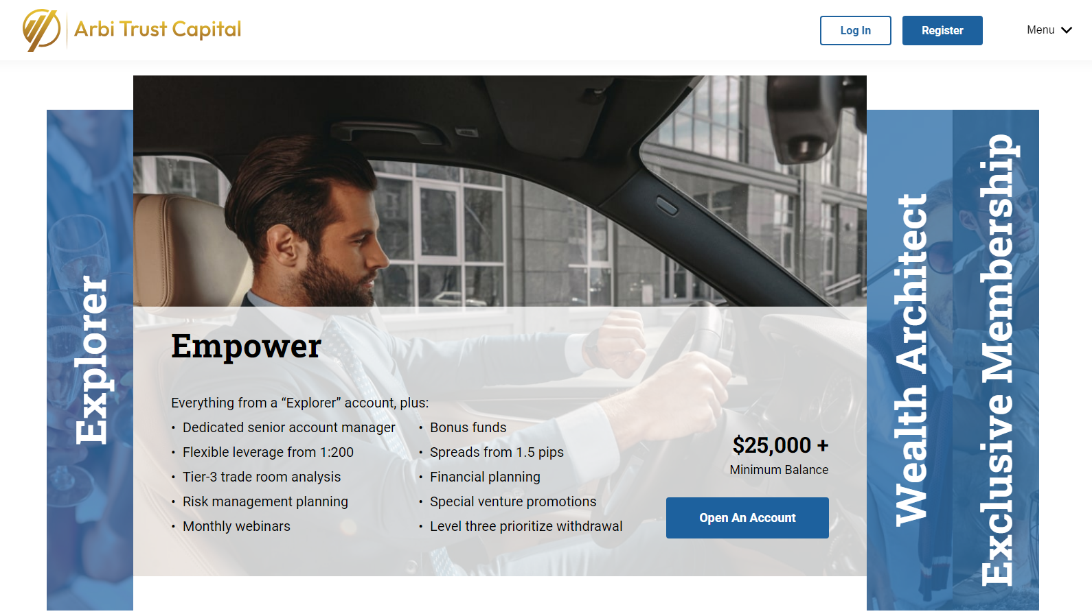 Clients have four tariff plans to choose from: Explorer (the minimum deposit is $250), Empower ($25,000+), Wealth Architect ($100,000+), and Exclusive Membership (Invitation only). Notice that the minimum deposit is relatively high, and the company does not offer a cent account or demo account, which would allow beginners to practice without risking significant money. The platform’s management has deliberately set the minimum deposit at $250 to secure larger deposits from their clients while avoiding those who cannot afford to risk that amount.