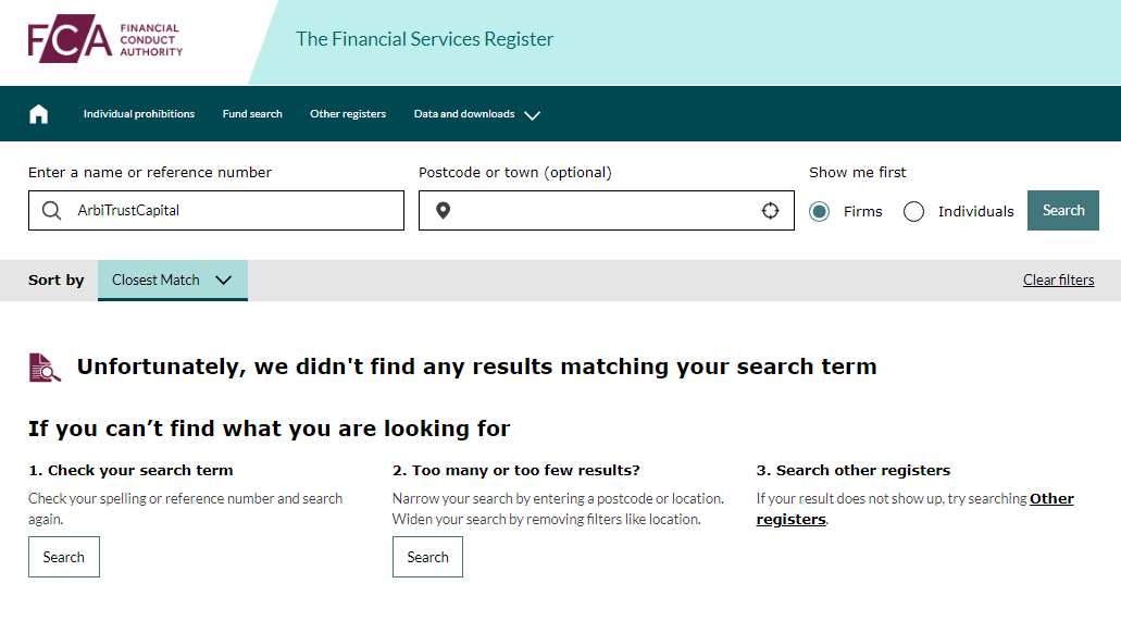 Is the broker regulated by financial authorities? The website says nothing about this, though based on the supposed headquarters in London, it should have a license from the Financial Conduct Authority (FCA). ArbiTrustCapital has not obtained FCA authorization to conduct brokerage activities, as confirmed by a check of the registry.