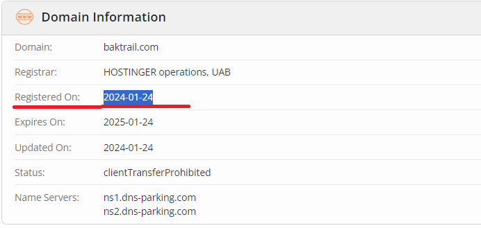 There is also other evidence that the company is fake. For example, according to the whois service, the domain baktrail.com was registered only in January 2024.