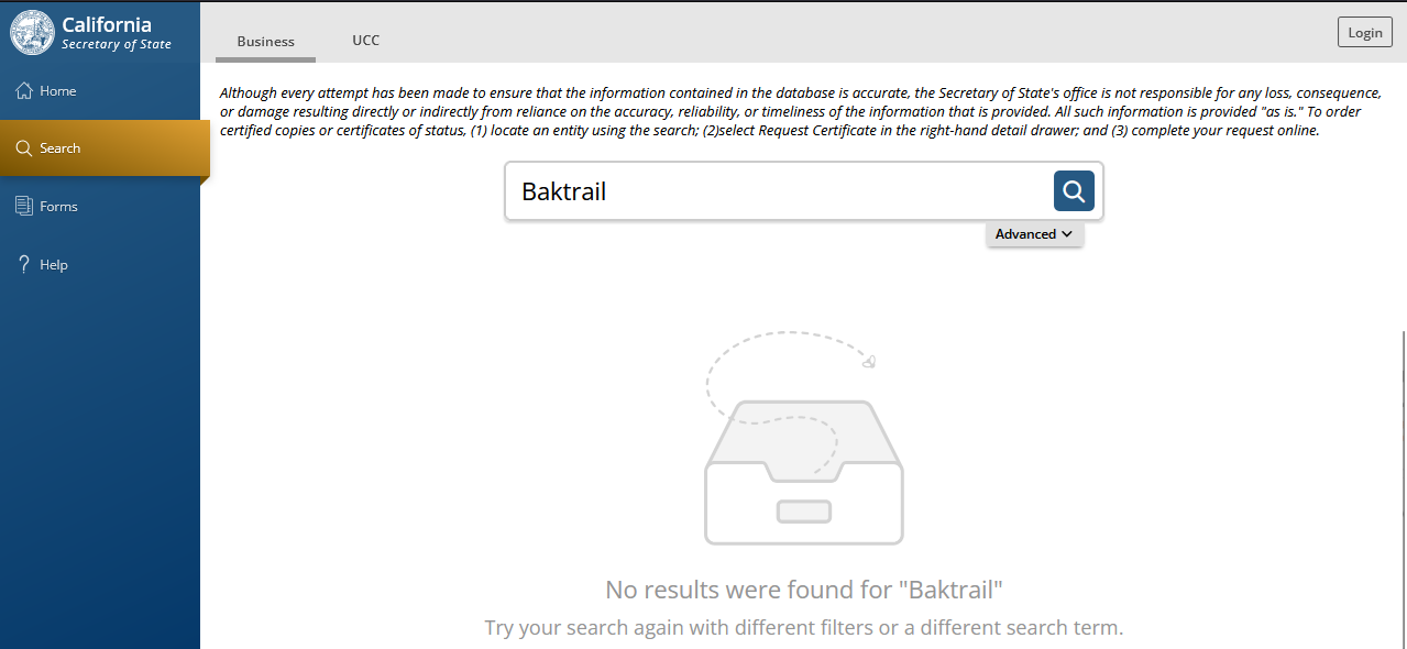 On the main page of the website, the service owners claim that the company is located in the United States and provide an address in San Jose, California. However, a check in the California Secretary of State database showed that there is no company named Baktrail registered in this state.