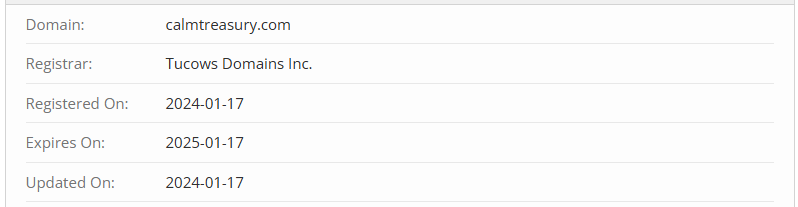 Additionally, Calm Treasury Holdings is a very young company. It only appeared in 2024, as evidenced by the domain registration date. The website launched in January 2024.