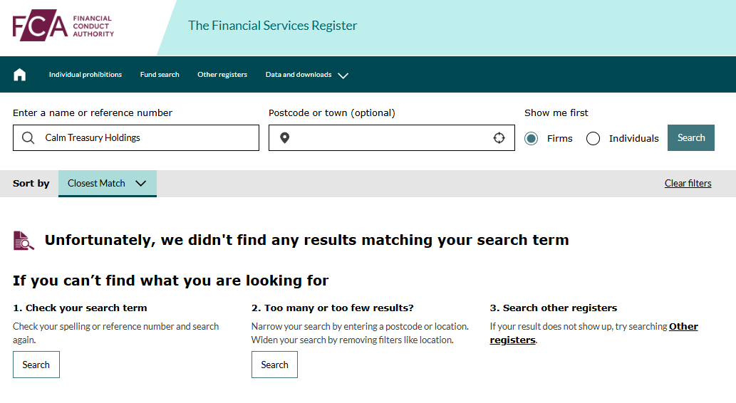 Although we already suspected that Calm Treasury Holdings lacked a license, we decided to verify it in the FCA registry for complete certainty. The FCA, the UK’s financial regulator, confirmed our suspicions — the broker has not been licensed by the FCA.