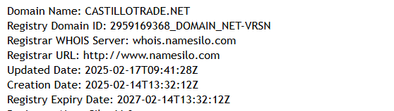 The operational history is not provided, which is not surprising. To determine how long the project has been active, we need to check the domain registration date. The domain castillotrade.net was registered on February 14, 2025 — just over two months ago. This is an extremely short lifespan.