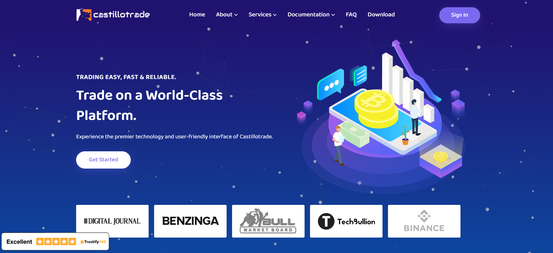 CastilloTrade uses marketing tricks to lure unsuspecting beginners. The homepage proudly displays the logos of Binance, Benzinga, and Digital Journal. However, there’s no official confirmation of partnerships on any of those companies’ websites. This is a blatant attempt to gain credibility by piggybacking on established brands. In the lower corner, there’s a Trustify360 rating labeled “Excellent”, supposedly showing that the broker is popular among traders.