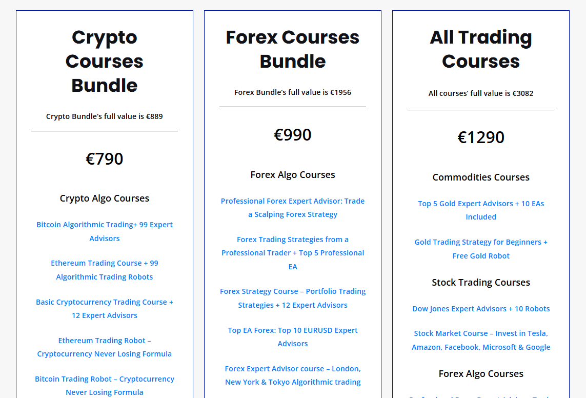 Second, clients can purchase complete training bundles. EA Trading Academy has developed three options:
