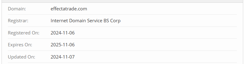 The broker also provides no information about how long it has been in business. However, we can confidently say that this is a young scam project that was launched very recently — in November 2024. The domain registration date for effectatrade.com confirms this.