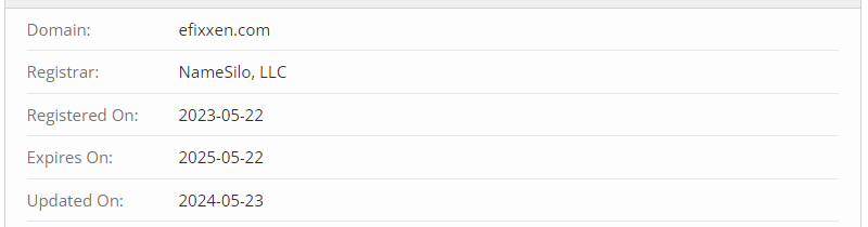 Do you think the organization has been in operation for a long time? This is a good and important question because any honest and verified company will definitely indicate the date of its founding on its official website, but not Efixxen, which decided to remain silent about this. Other methods will have to be used to find out when the platform might have been launched and what experience it has. For example, the useful service Whois revealed that the domain was registered on May 22, 2023, so this broker is about a year old, maybe even less. Such a period is not considered long or serious.