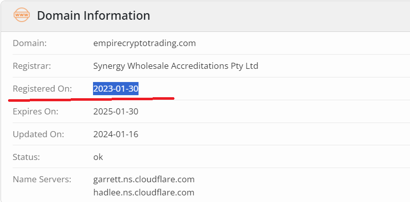 Information about the company’s existence is confirmed by the whois service data. According to its information, the domain empirecryptotrading.com was registered on January 30, 2023, which aligns well with the company registration date.