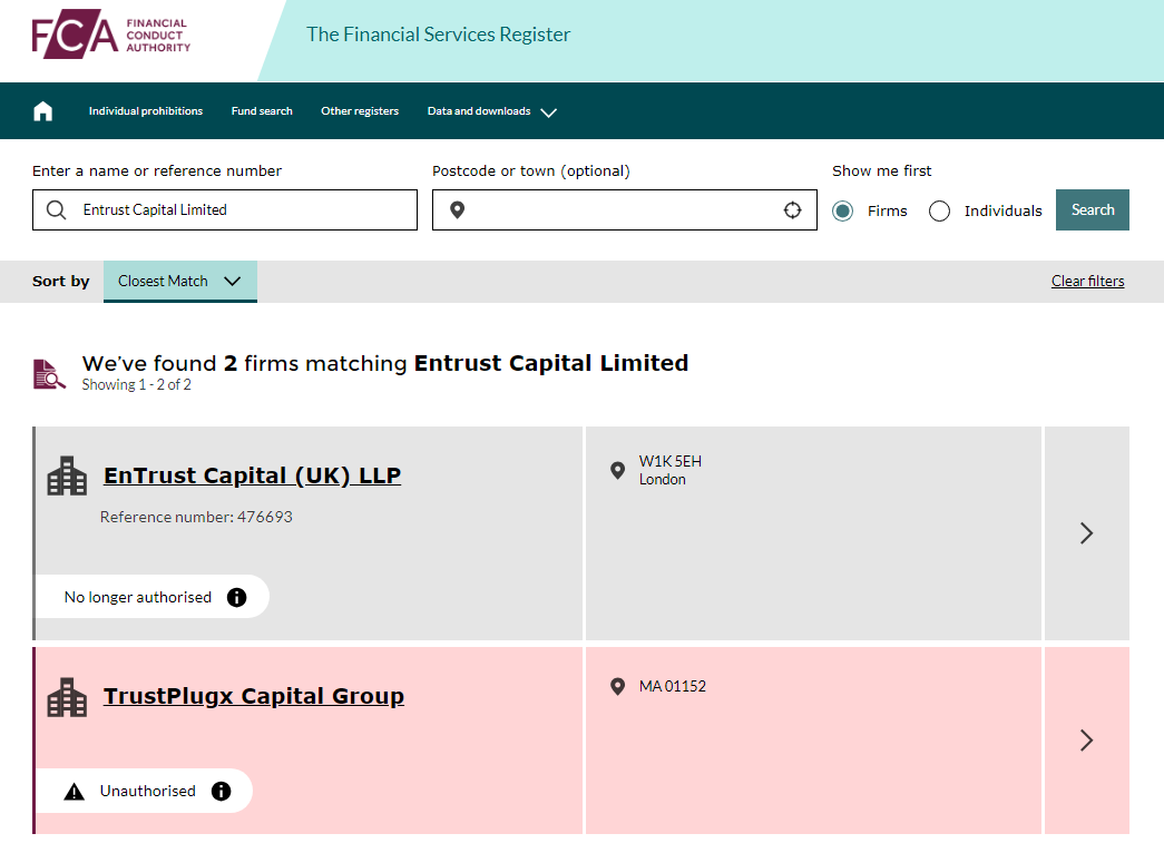 Does Entrust Capital Limited actually have licenses? Not in the DFSA, nor in the FCA. Why the FCA? Because besides the office in the UAE, the firm boasts branches in the UK, which means it should be regulated by the British financial commission. As you can see in the screenshot below, such a broker is not listed among the legal companies in the FCA.