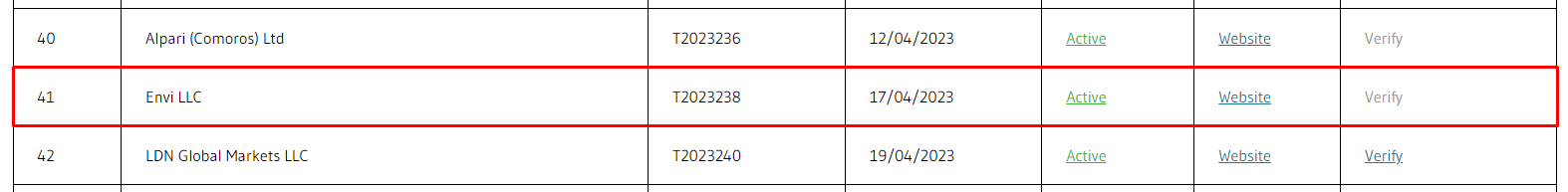 Next, we should mention the MISA registry, which oversees the activities of forex dealers in Mwali. The registration number T2023238 indicates that Envi FX registered there in 2023.