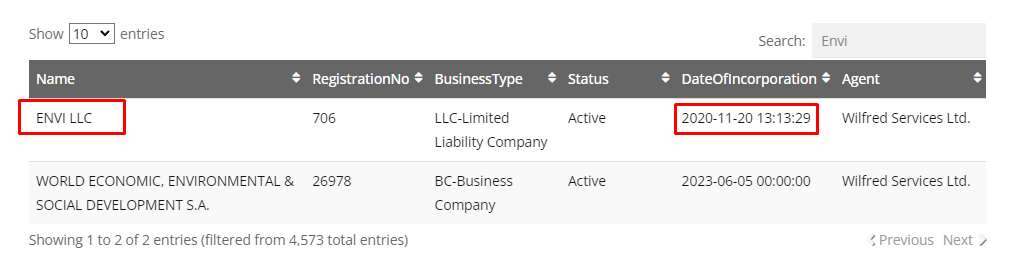 Let’s start with its offshore jurisdiction of Saint Vincent and the Grenadines. A check of the SVGFSA registry by name does indeed confirm the official registration of Envi FX, and the company has been registered since 2020.