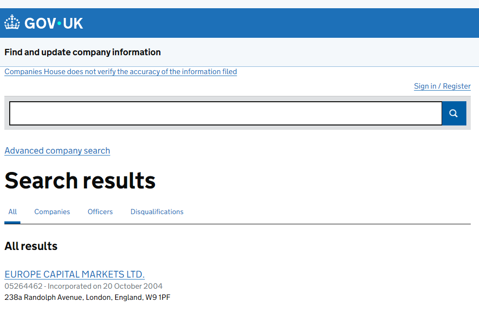 The most interesting part begins when checking Companies House. There is indeed an organization with the name Europe Capital Markets Ltd listed in the register. It was registered back in 2004 and has a specific legal address. However, it is important to understand one simple thing: the existence of a company with that name in Companies House does not mean that the website europecapitalmarkets.com has any connection to it whatsoever.