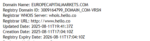 The subject of this review claims “10 years of experience”, but the domain europecapitalmarkets.com was registered only in August 2025. This is documented in WHOIS data and is easy to verify. Before that date, there was no website, no platform, and no public activity under this domain. Therefore, claims of many years of operation are a direct falsehood, not supported by the domain history or the project’s timeline.
