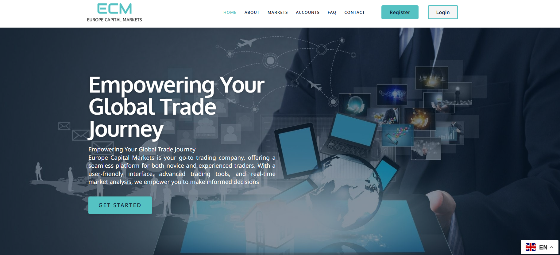 The design of the official website follows a standard brokerage style: blue and turquoise gradients, abstract illustrations with charts, laptops, growth arrows, and a world map. All of this has been used for years by dozens of questionable CFD platforms and has long ceased to be a sign of a real broker. Europe Capital Markets has created a visually pleasant website, but it immediately feels like a template-based landing page rather than a platform with real trading infrastructure. The main screen greets visitors with clichéd phrases about a “global trading journey” and promises of a convenient platform, advanced tools, and real-time analytics.