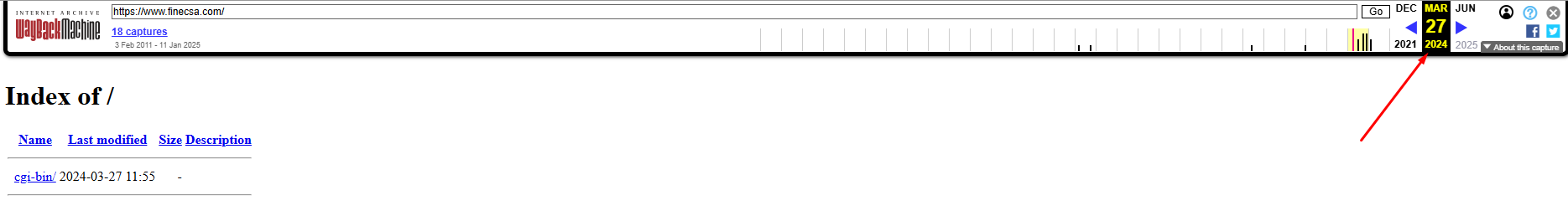 What about the length of operation? How long has the platform been conducting its illegal activities? The founding date is also ignored on the official website finecsa.com. Alright, then let’s check the Whois service to find out the domain registration date. The domain was created in 2019, but judging by snapshots from WebArchive, the brokerage platform didn’t exist on it until 2024. For example, in March 2024, the web page for the domain contained no content other than the cgi-bin folder. This could mean that the website was either not launched yet, was under development, or was temporarily offline.