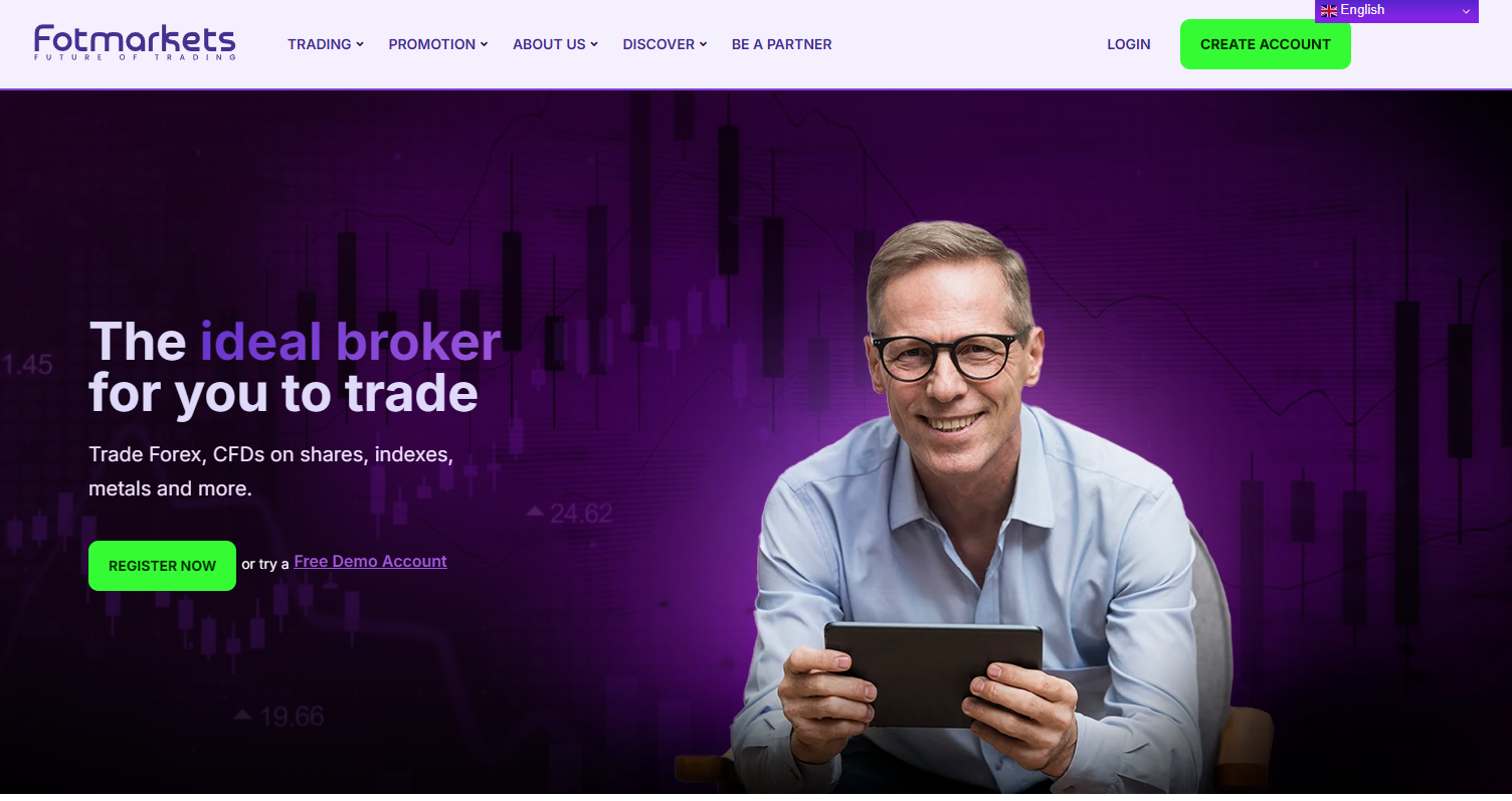 The official Fotmarkets website looks like a typical template landing page used by offshore brokers. The design relies on purple and green accents, resembling more of an advertising banner than the website of a serious financial institution. Every page features generic stock images of “successful traders”, smiling men in suits, 3D graphics, and identical charts unrelated to actual market data.