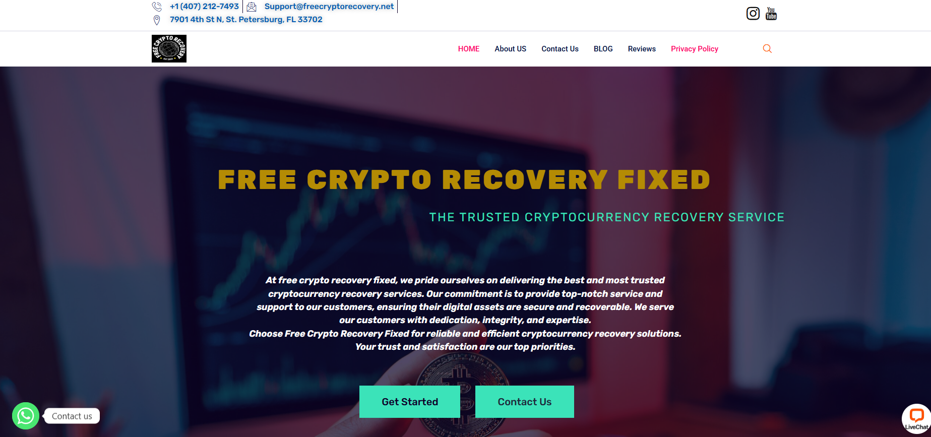 Additionally, the company offers a WhatsApp chat and an online chat feature. There is also a contact form for sending messages. Oh, and Free Crypto Recovery Fixed has Instagram and YouTube accounts — but they have very few followers and almost no activity. It is highly unlikely that company representatives will respond to you there.