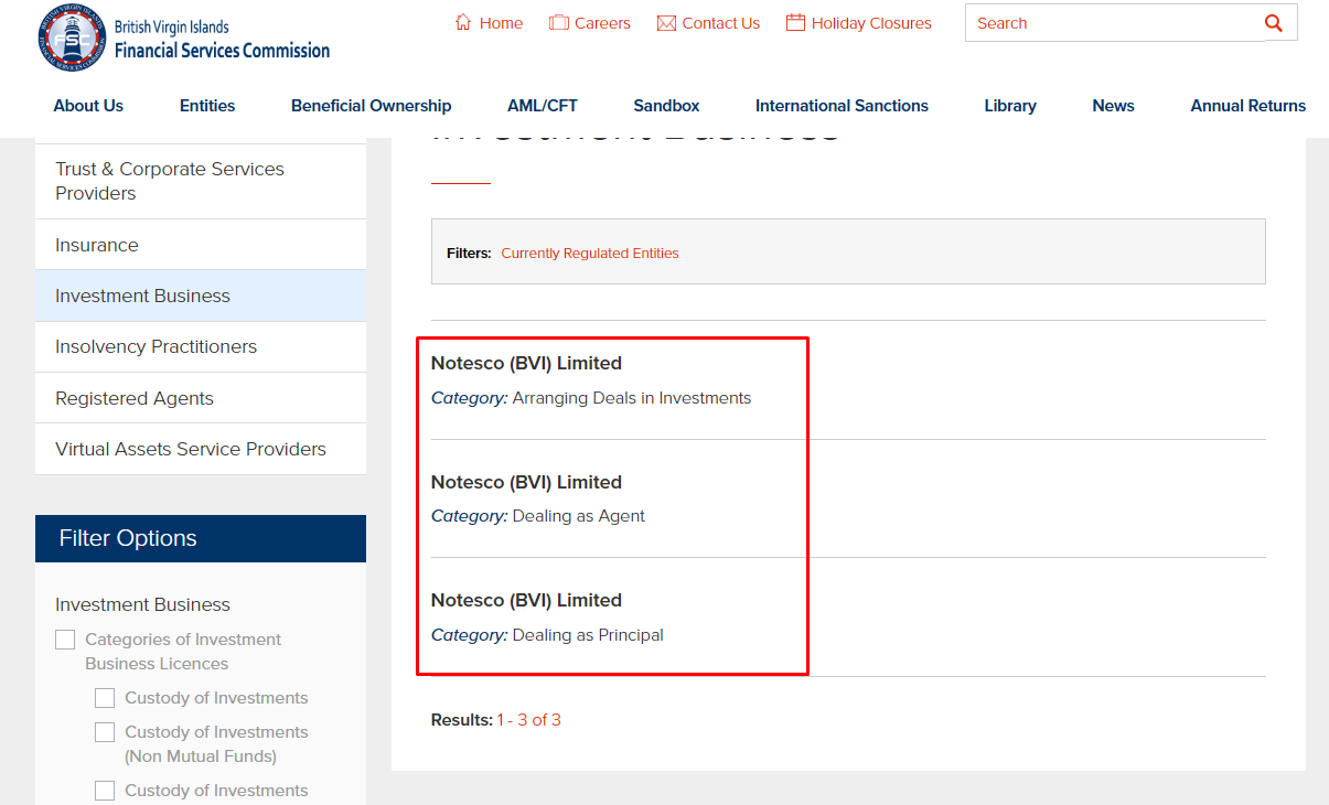 Next, it is necessary to review the company’s legal details. The broker lists the legal entity Notesco (BVI) Limited, which is registered in the jurisdiction of the British Virgin Islands and holds a local license. This information needs to be verified.