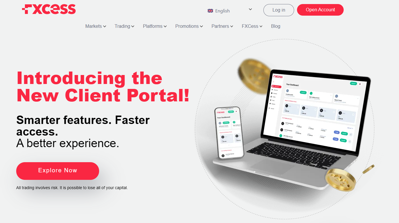 The visual appearance of the company’s official website is standard, similar to most other brokerage platforms. FXCess uses a typical offshore broker structure: a top navigation menu, a homepage listing supposed advantages, and a footer containing legal information and risk warnings.