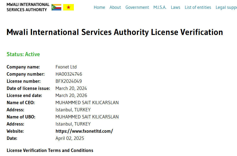 If we open the registry of the Mwali International Services Authority (MISA), we do indeed see a company named Fxonet Ltd with license BFX2024049, registered in March 2024. However, there is a major issue.
