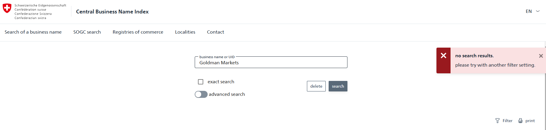 Several online sources state that Goldman Markets’ office is located in Switzerland, so we should check the official legal registry of that country. Not surprisingly, the search yielded no results because no such organization is registered in Switzerland.