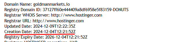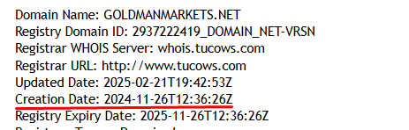 Furthermore, Goldman Markets started operating only recently, so they have no significant operational history or experience, which means their bold claim of having 50,000 clients is a fake. The first domain used by the scammers, goldmanmarkets.net, was registered on November 26, 2024. This website is no longer working. Apparently, there were too many negative reviews and complaints, so the fraudsters had to shut it down.