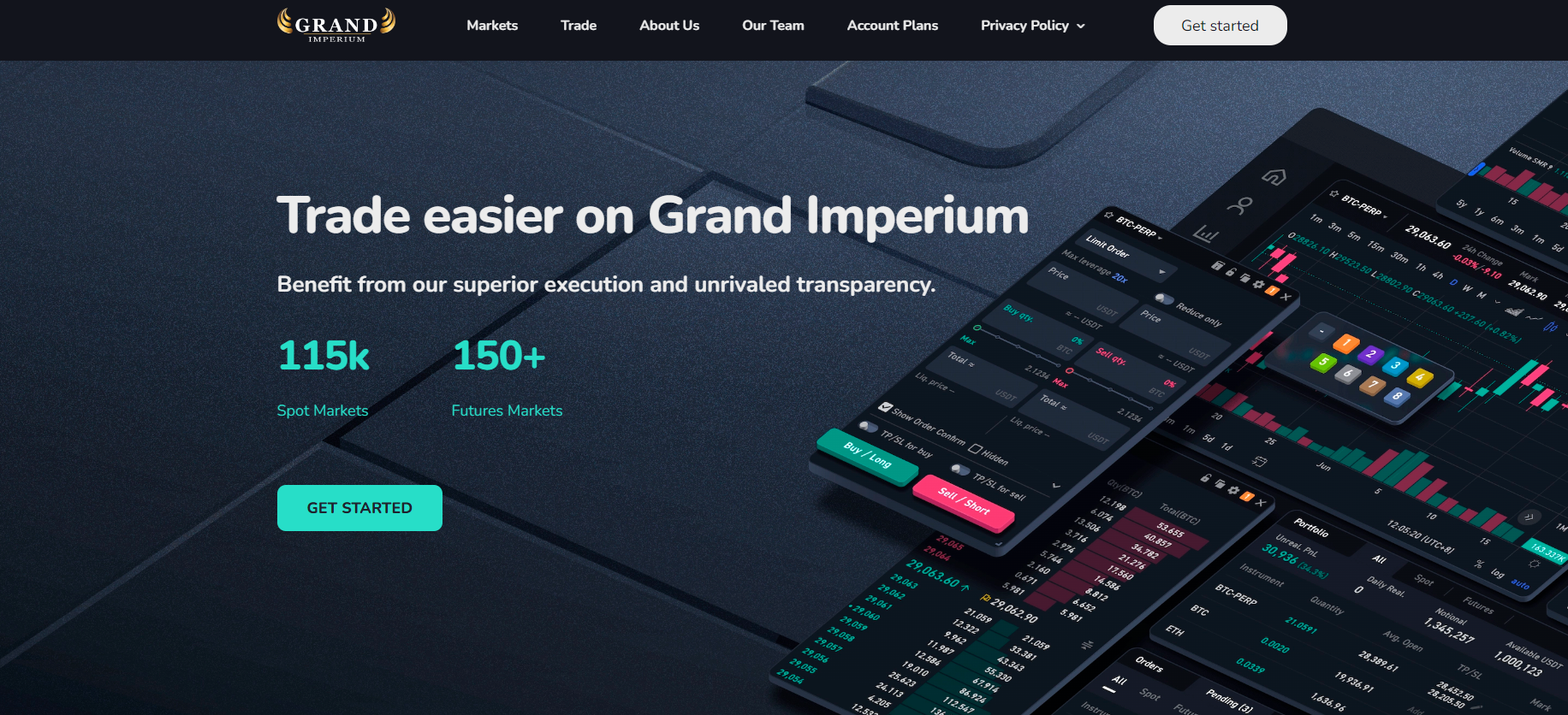 The section list is standard: “Markets”, “Trade”, “Our Team”, and “Account Plans”, but oddly enough, there’s no contact section. Based on the content, this isn’t a CFD broker but more of a crypto project, as there are constant mentions of DeFi, major crypto projects, and exchanges. It seems like Grand Imperium is intentionally misleading visitors to their website.