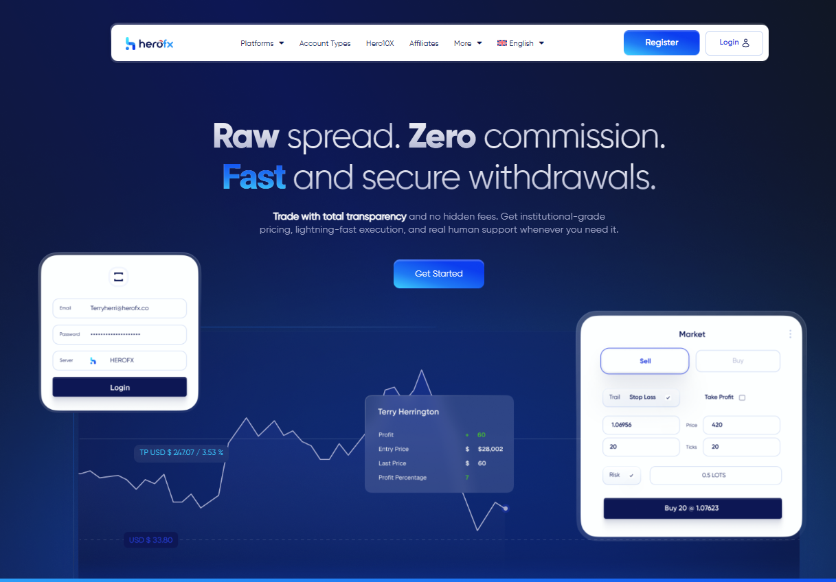 Visually, the HeroFX website is designed in a “modern” style. A dark gradient, large headings, plenty of white space, and neat Register and Login buttons. The very first screen targets traders’ pain points directly: “Raw spread. Zero commission. Fast and secure withdrawals.” This is a classic lure aimed at scalpers. The design looks expensive, but it is more about selling an emotion than about disclosing actual details.