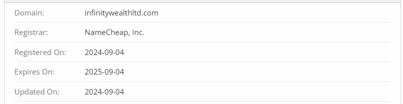 Additionally, we checked the company’s domain. It turns out that infinitywealthltd.com was created only in September 2024, very recently, which confirms that Infinity Wealth LTD hasn’t been operating as long as they claim.