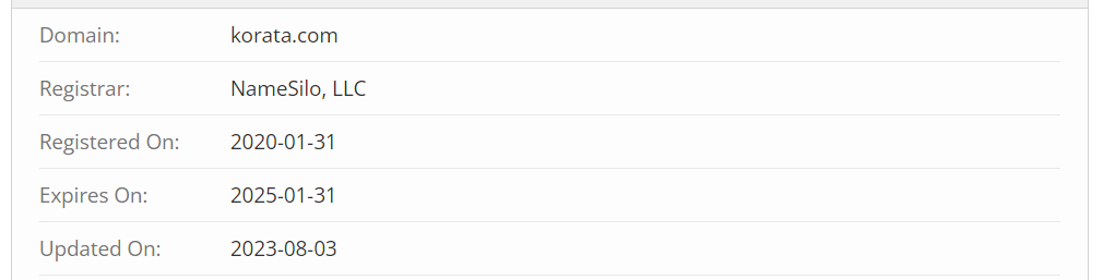 Registration number 2023-002451 hints at the founding date of Korata. Although the domain was registered in 2020, it was only purchased by the scammers in 2023, presumably in August. Based on this information, a logical conclusion can be made — the platform has only been in operation for a year. This is a short period during which it is impossible to build a reputation as a safe intermediary or earn the trust of hundreds of thousands of clients.