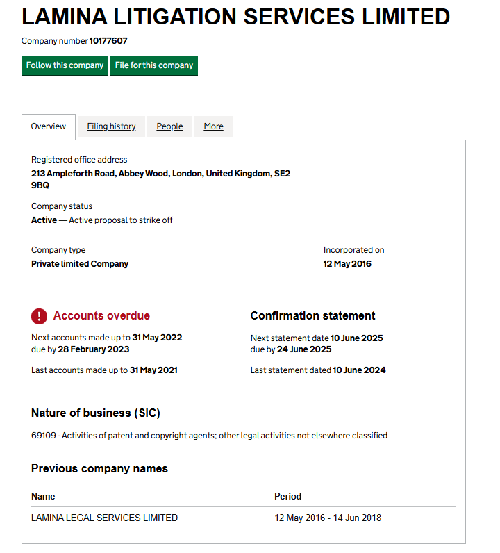 Next, we checked the UK Companies House registry. While there is a company named Lamina Litigation, it is an entirely different entity. Firstly, its activity is classified as “69109 – Activities of patent and copyright agents; other legal activities not elsewhere classified”. Secondly, it was registered in 2016, while the subject of this review appeared no earlier than 2023-2024. Thirdly, the company has a status of “Active proposal to strike off”, which is also a negative indicator.