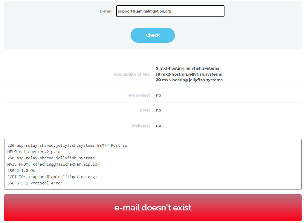 The email address listed for Lamina Litigation is fake. Yes, you read that right. The provided email doesn’t even exist. It’s a complete fake. A professional and serious firm providing fake contact details? That’s quite something.