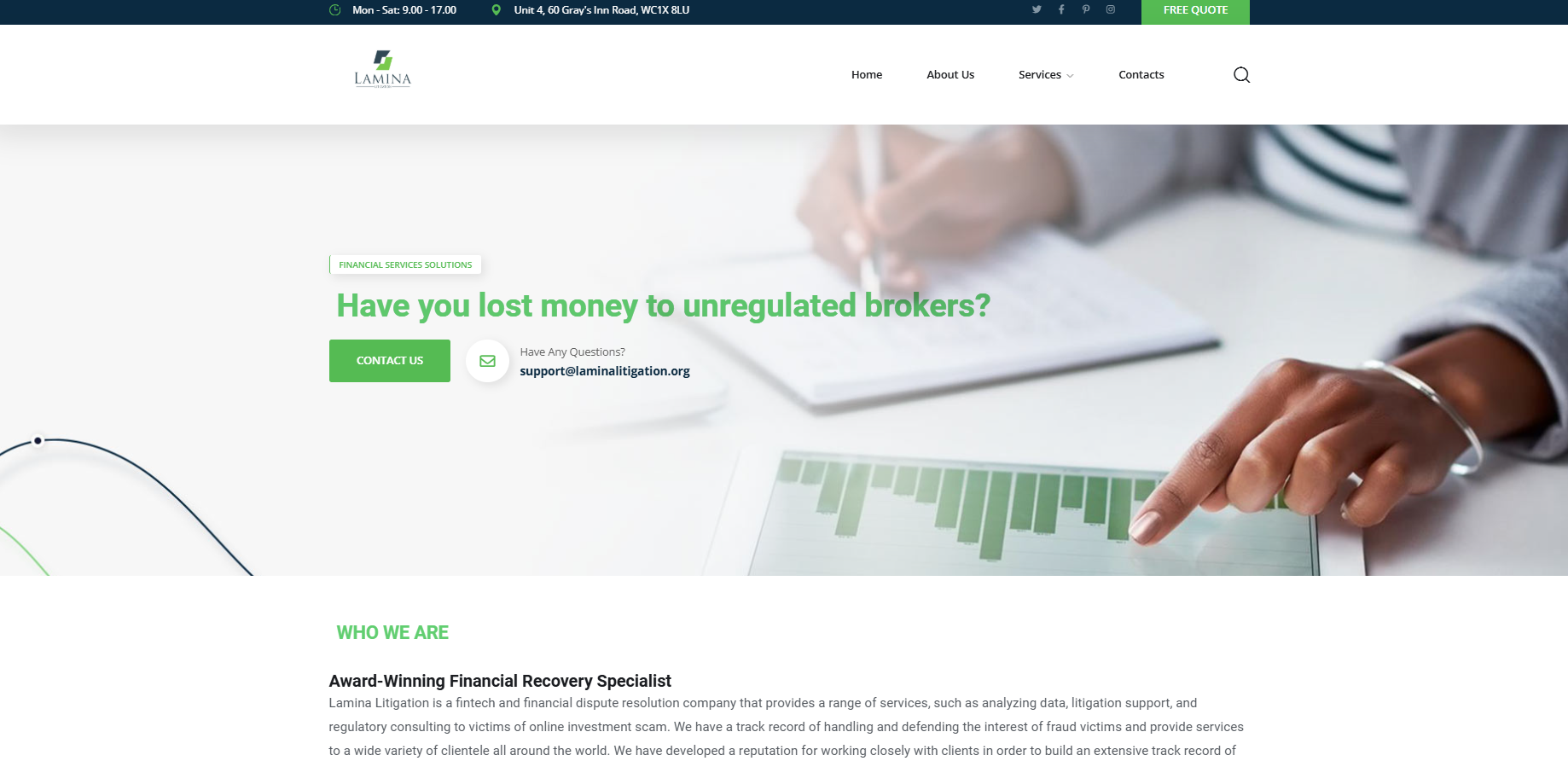 Lamina Litigation claims to offer services for recovering funds lost to forex scams, cryptocurrency fraud, and investment schemes. It sounds like the standard repertoire of a chargeback company. However, the lack of details about their process is concerning. There’s no information about how they operate, which banks or payment systems they work with, or what legal methods they use. It all feels like empty promises.