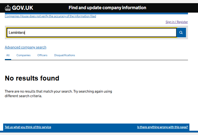 In fact, there is no such entity in the UK, and the legal address is simply fake. A quick check with Companies House confirms the absence of a registered legal entity.