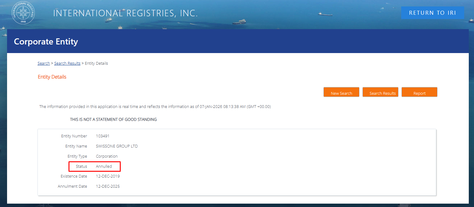 After that, we separately verified the legal information LexaTrade cites in its documents. The company refers to the registration of Swissone Group Ltd in Saint Vincent and the Grenadines and in the Marshall Islands. Checks of the official registries revealed a critical fact: in Saint Vincent and the Grenadines, the company’s status is Cancelled, with the original registration dated 2017, and the registration has been revoked. A similar situation exists in the Marshall Islands, where Swissone Group Ltd holds an Annulled status, with the annulment dated December 2025.