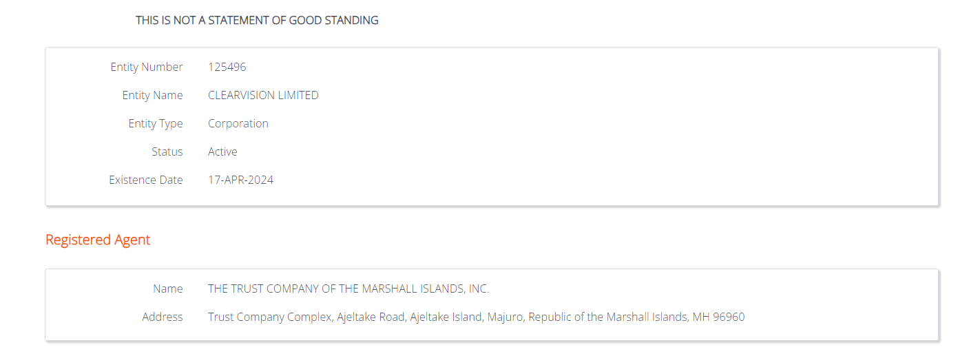 Legally, the company is registered in the Marshall Islands under the name CLEARVISION LIMITED. We managed to find this firm in the legal registry of the Marshall Islands.