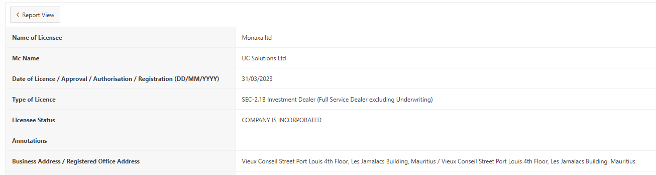 The firm lists its legal entities as Monaxa Ltd, registered in Anguilla and the Republic of Mauritius. This is indeed true — we checked the regulators’ registries. For example, the MFSC license was obtained in 2023. However, this does not provide any real guarantee of reliability.