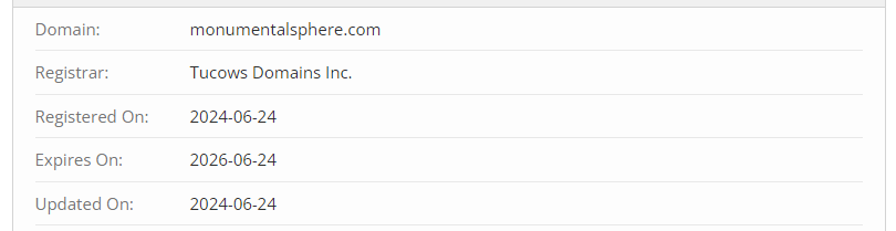MonumentalSphere is a very secretive platform. Besides the addresses, there is no other information provided. Even the founding date is hidden, although the reason for this is obvious. The scammers didn’t want to lie about their experience, so they simply left out any details about their operating history. However, the domain registration date shows that the company only started operating in June 2024.