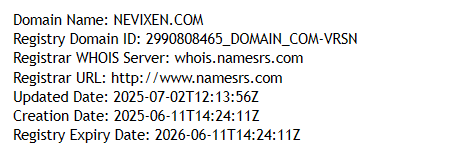 The company does not disclose its founding date or the history of its brand. According to WHOIS, the domain nevixen.com was registered on June 11, 2025. That is the true starting point. There is no “many years of experience” here — this is a freshly created facade with no reputation and no track record.