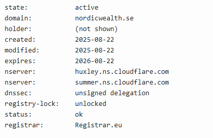 On one of the homepage images, the company claims to have 14 years of experience. However, that’s just a decorative picture with no connection to reality. In truth, the domain nordicwealth.se was registered only in August 2025 — that’s the real age of the project.