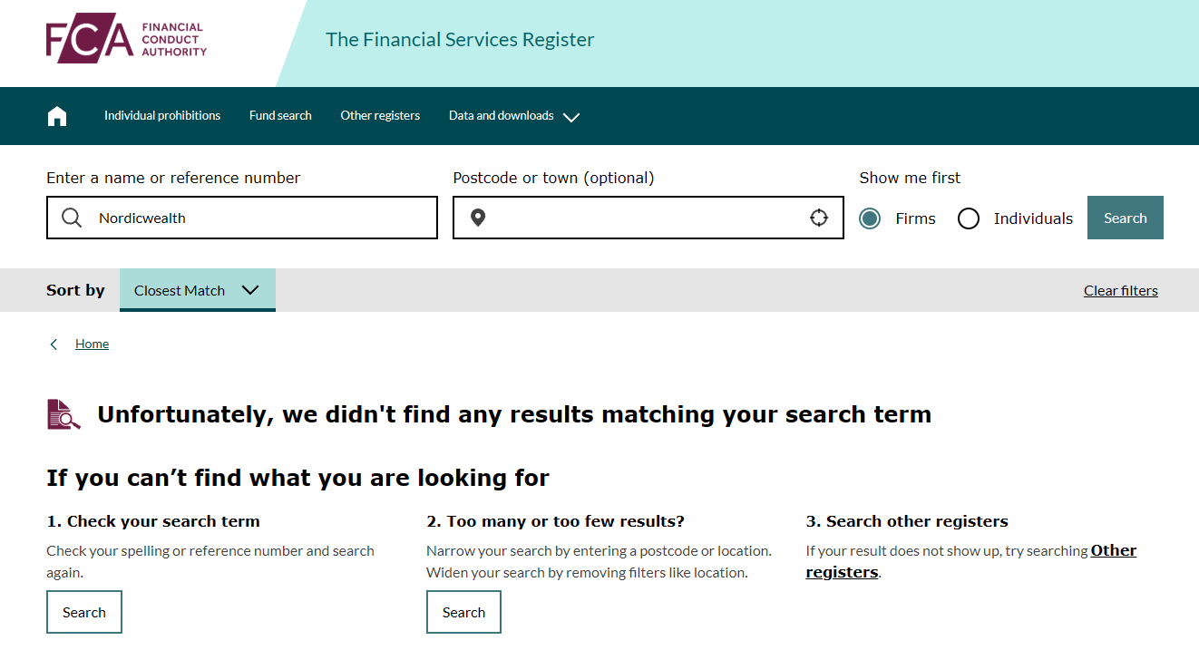 In the “About” section, one can see an alleged FCA license and a Companies House registration certificate. We checked whether these were genuine, and they are not. According to the official FCA register, there is no broker named Nordicwealth listed.