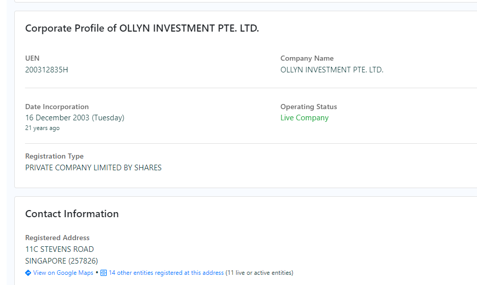 According to the company’s narrative, it is legally based in Singapore. Is that really the case? Why, then, is there no license from Singapore’s MAS? Probably because this broker doesn’t actually exist in Singapore. More specifically, Ollyn Investment PTE LTD does exist in Singapore, but it’s a completely different organization, with no connection to ollyninvestment.com. The legitimate Ollyn Investment PTE LTD was indeed registered in 2003. However, the scammers created their fake platform with the same name in August 2024.