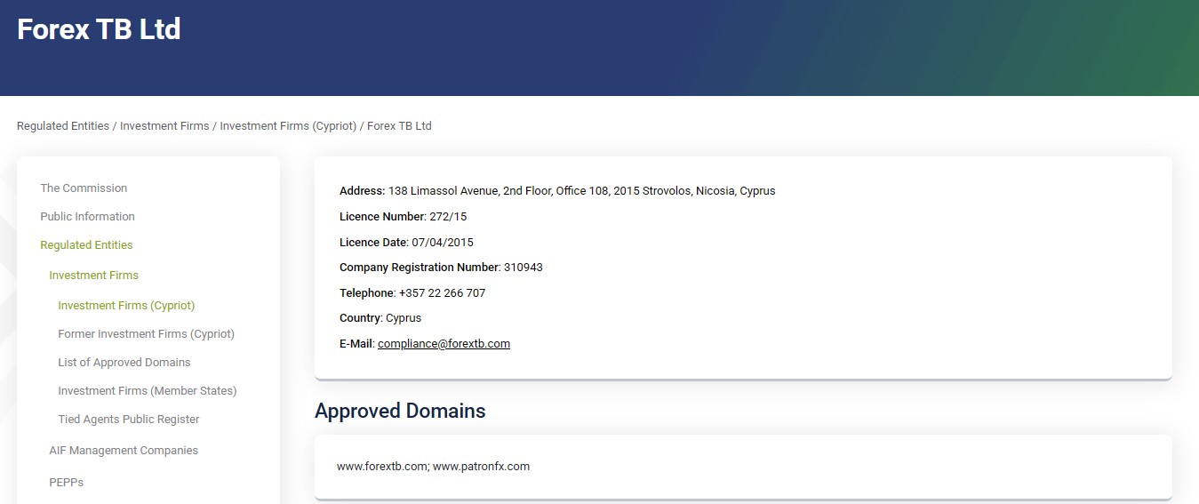 The legal information is placed at the bottom of the pages. It states that the brand is operated by Forex TB Limited, a company registered in Cyprus. It holds CySEC license No. 272/15. The address is listed as well, meaning that, formally, the broker is a Cypriot CIF regulated by the Cyprus Securities and Exchange Commission.
