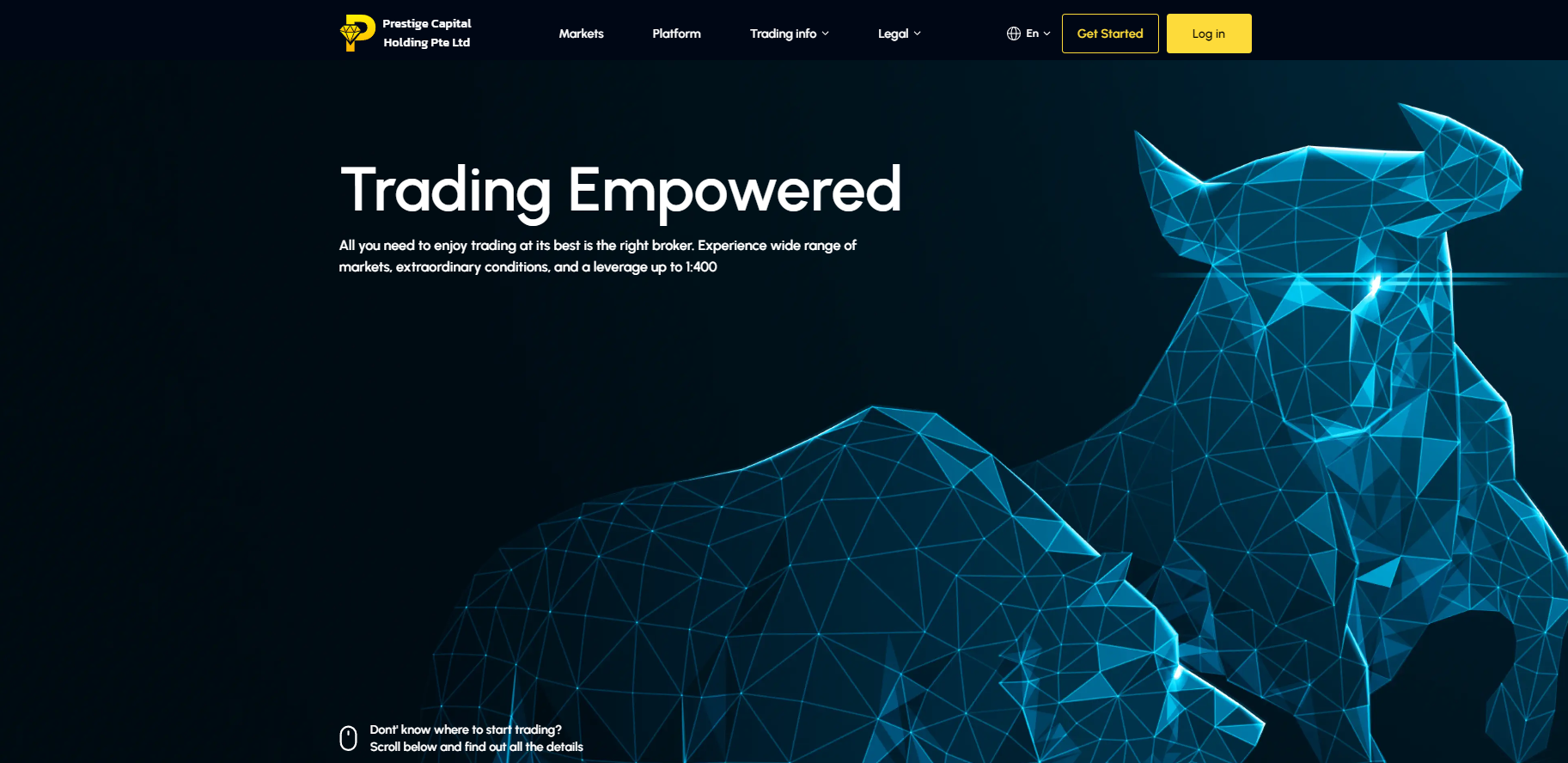 From the very beginning of exploring the website of Prestige Capital Holding Pte Ltd, it’s hard to say anything positive about it. The design is based on a standard template that can be found on countless other platforms. The background image of a bull, done in digital graphic style, looks stylish but has no practical value. Such flashy elements seem more like an attempt to attract attention with outward sparkle rather than actual substance.